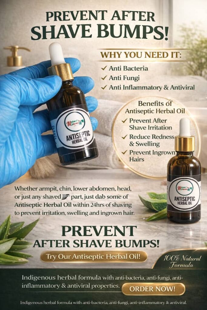 Picking or shaving over bumps can spread irritation and can cause ingrown hairs from nearby. This Antiseptic Oil treats ingrown hair.